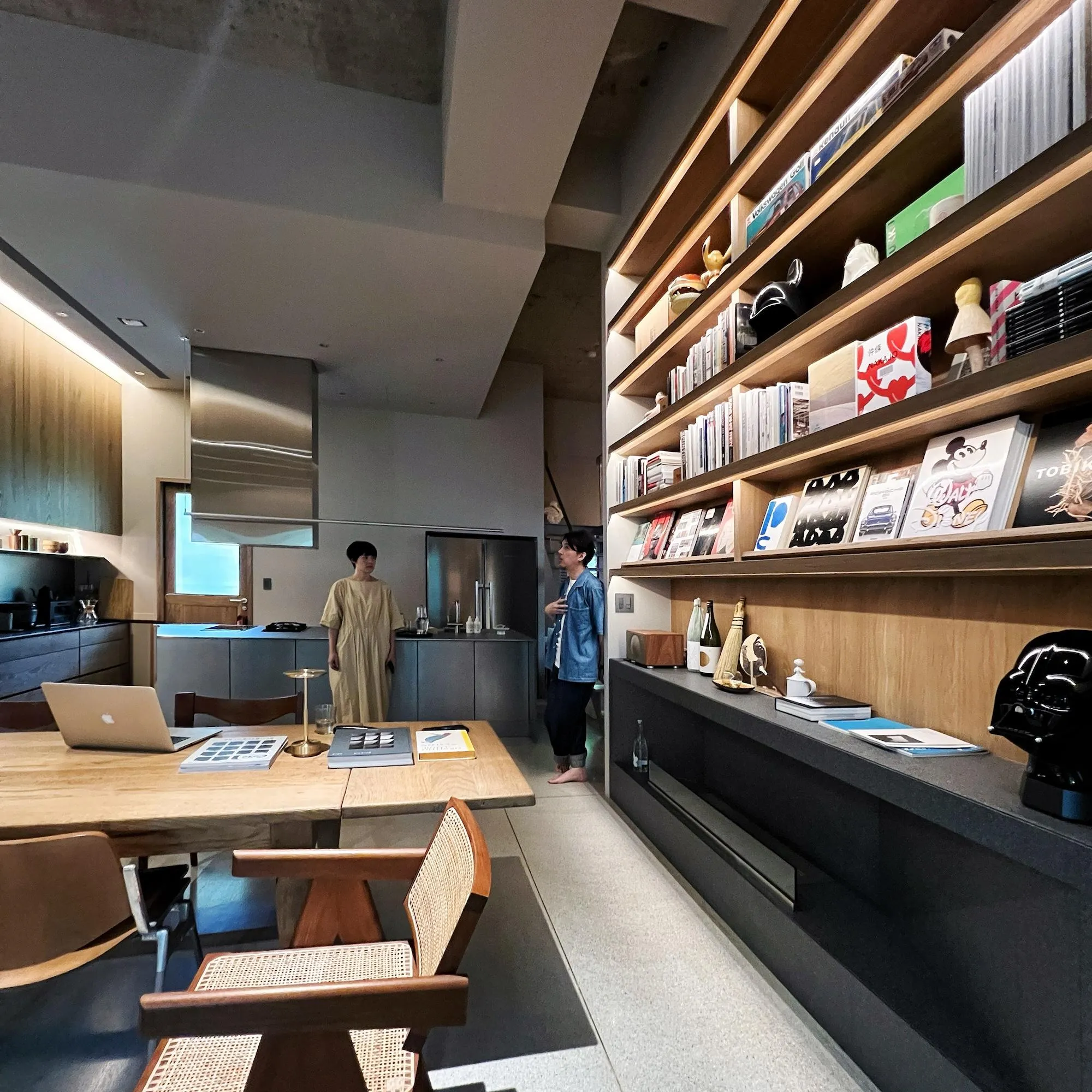 整體空間由實見空間設計游思維設計師操刀,女主人喜愛茶藝以及料理,男主人有豐富的書籍雜誌的收集,因此在空間不同區域分別滿足兩人的使用需求,開放寬敞的廚房空間、閣樓上的榻榻米茶室、進門就無法忽視的挑高書牆展示,都能讓初來乍到的訪者進門就可以嗅出空間主人各自的喜好。